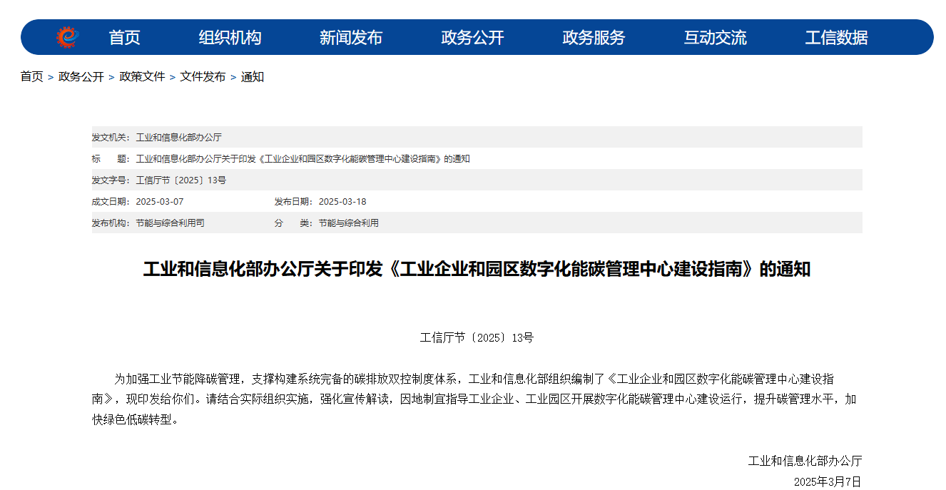 工業(yè)和信息化部于2025年3月正式印發(fā)《工業(yè)企業(yè)和園區(qū)數(shù)字化能碳管理中心建設(shè)指南》(工信廳節(jié)〔2025〕13號),為能碳管理系統(tǒng)的建設(shè)提供了國家標(biāo)準(zhǔn)指導(dǎo)。